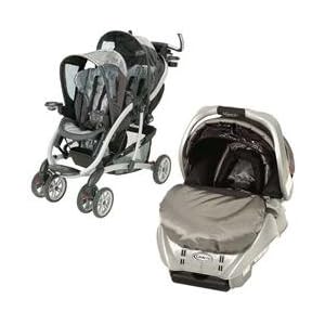 The Graco Quattro Tour Double Travel System For parents shopping for a deal but unwilling to compromise on safety and comfort! The Graco Quattro Tour Double Travel System combines a quality Graco tandem double stroller and the Consumer Reports top-rated Graco SnugRide car seat. Also included is a Graco SnugRide car seat base. Additional bases are available seperately for purchase from BabyAge - a fantastic concept that makes switching vehicles effortless! This is a terrific bargain that blends style with peace-of-mind and security. This system will grow with your babies - the rear seat is suitable for children up to 40 pounds, and the front seat can accomodate a child weighing up to 50 pounds! Editor's Note: As only one infant car seat can be used with the Quattro tour travel system Graco Quattro double tandem stroller, we recommend this system for families with one infant and one older baby. If you are looking for a travel system for infant twins, perhaps the Stroll-Air Spider Duo, or a similar side-by-side stroller system, would work better for you.Quattro tour travel system